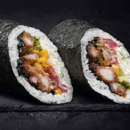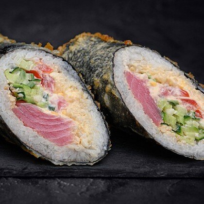 410 гр. Запеченый лосось, огурец, томат, перец болгарский, листья салата, сырный соус, соус терияки, рис, нори, панировка на 100 гр: Б 6,95/Ж 7,32/У 30,82/Ккалл 216,96