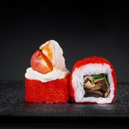 360 гр. форель, креветка, крабовый сурими, авокадо, соус никкери, икра чёрная имитация, рис, нори