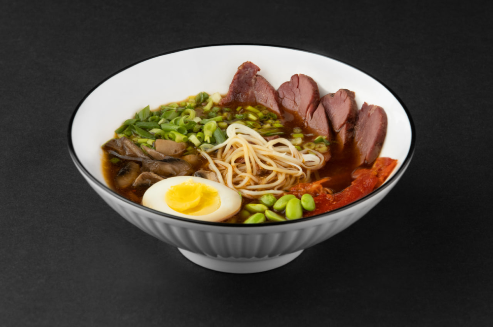 520 гр. мясной бульон на основе соевого соуса, ростбиф, перец чили, ростки бобов, бобы эдэмаме, шампиньоны, яйцо, лук зелёный, лапша яичная на 100 гр: Б 8.09/Ж 5.59/У 5.32/Ккалл 103.95