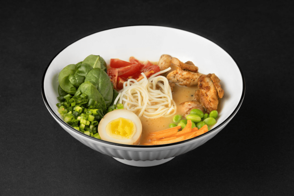 мясной бульон на основе мисо пасты, бедро куриное, черри, шпинат, морковь, яйцо, лук зелёный, бобы эдэмаме, лапша яичная