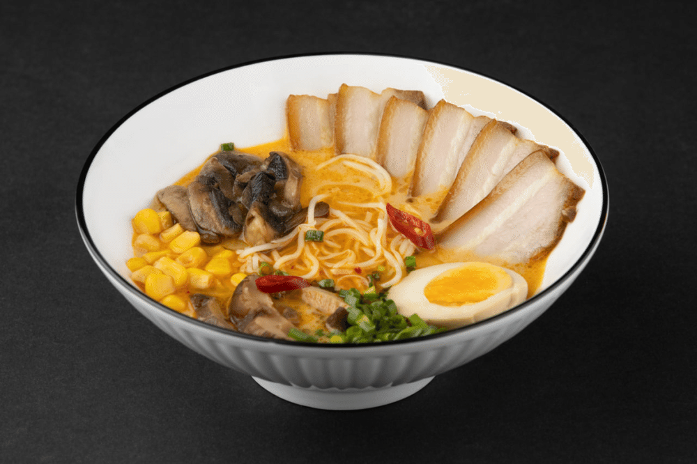 сырно-мясной бульон, запечённая свиная грудинка, шампиньоны, шиитаке, лук зелёный, яйцо, кукуруза, сыр чеддер, лапша яичная