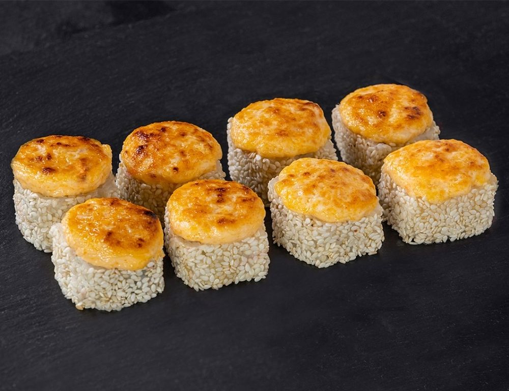 Копченый угорь, кунжут, сливочный сыр, икра тобико, сырный дип , рис, нори (возможно попадание мелких мускульных косточек в угре)