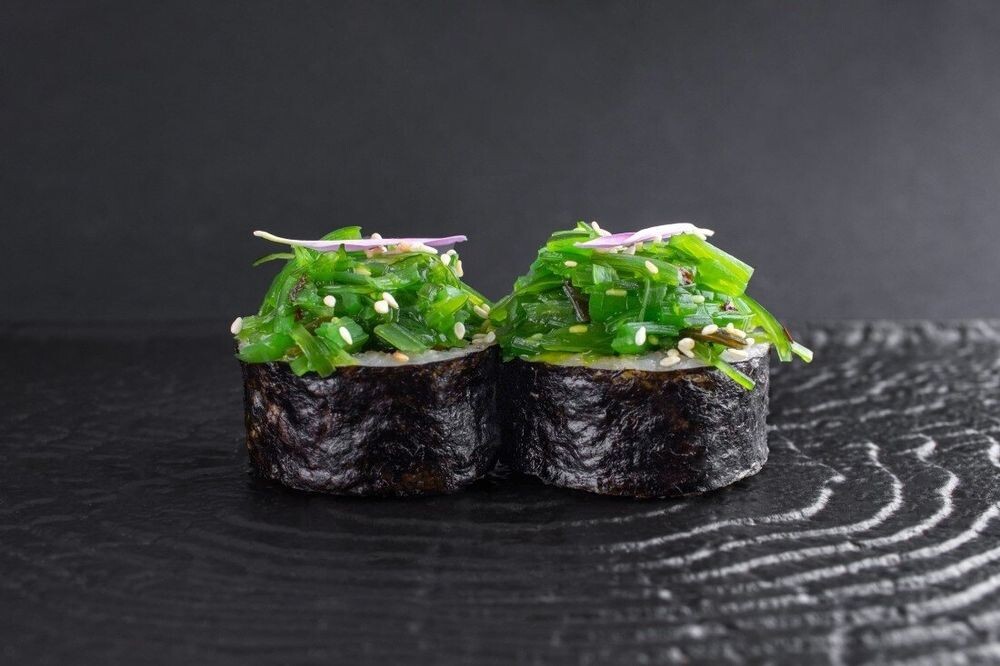 Брокколи, морковь и шампиньоны обжаренные в терияки с тофу,рис, нори,водоросли чука,кунжут
