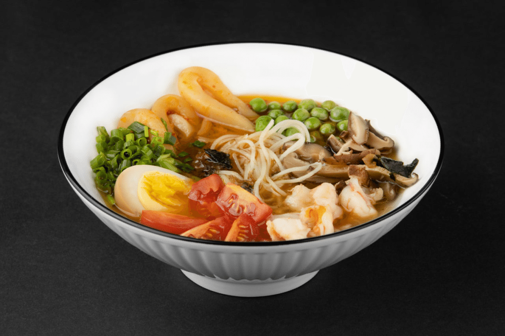 рыбный бульон на основе даси, кальмар, кимчи, креветка, шиитаке, черри, горох зелёный, яйцо, лук зелёный, лапша яичная