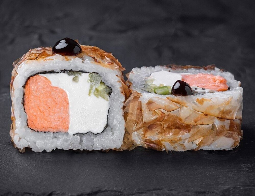 Запеченый лосось, сливочный сыр, огурец, стружка тунца, рис, нори